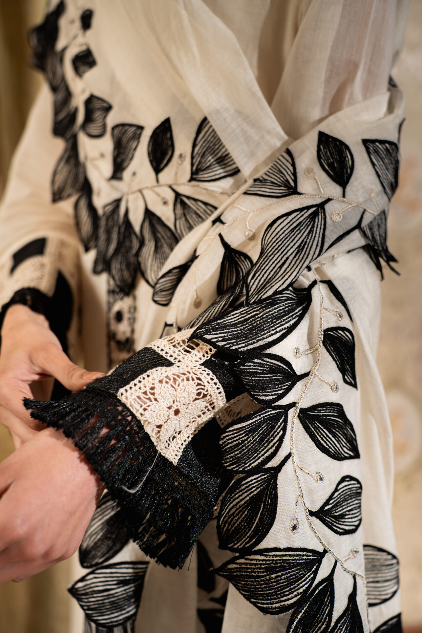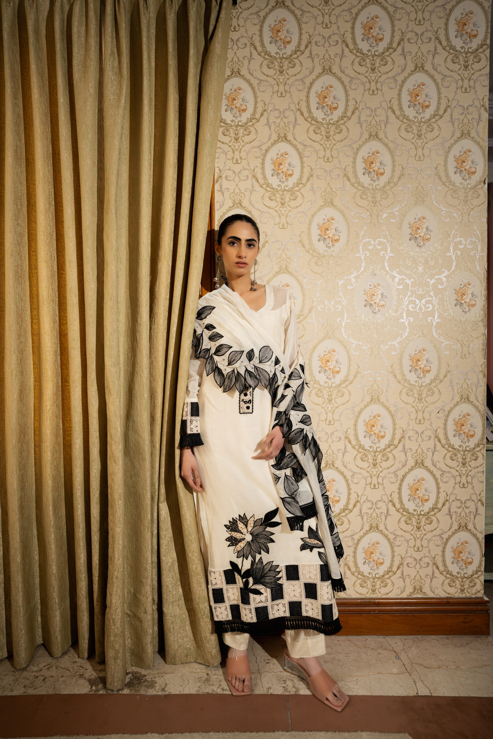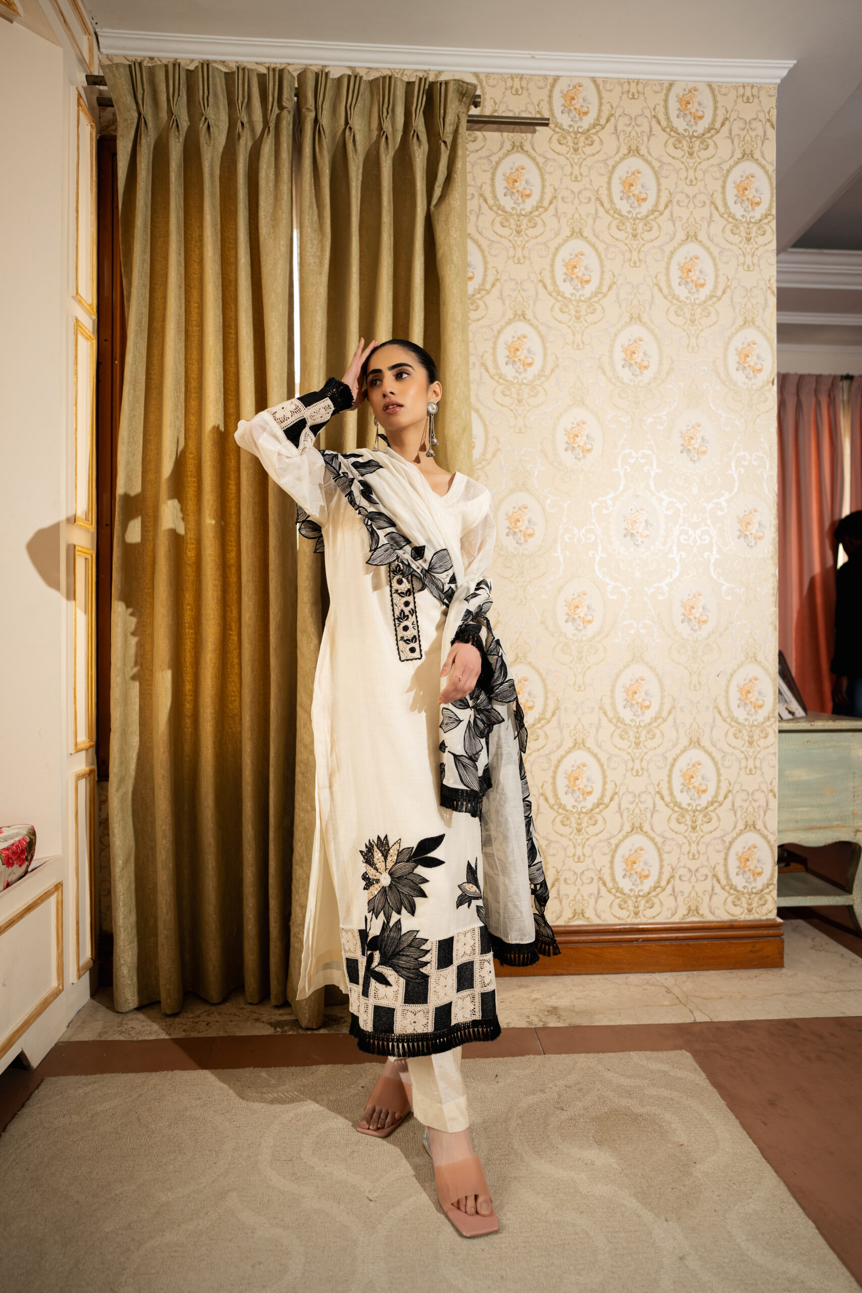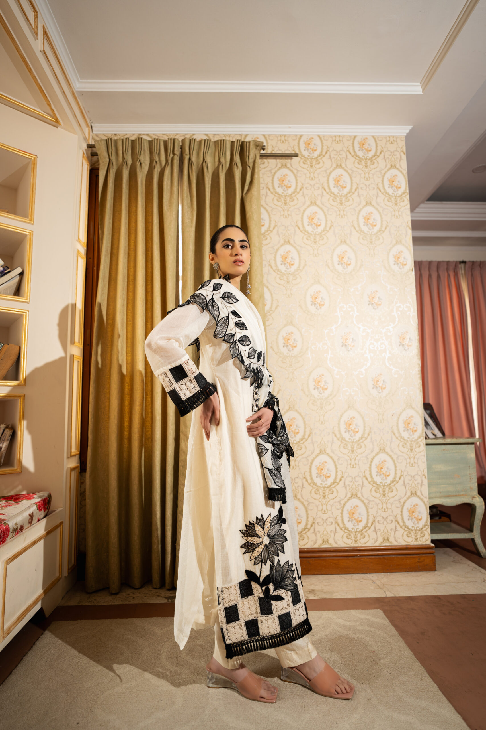 - Design: Beautiful black embroidery and intricate patterns enhance the outfit’s charm, making it a statement of refined luxury.